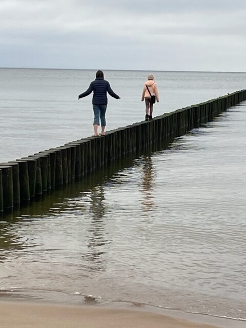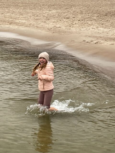 På stranden gick jag och Maja på vågbrytarens stubbar. Jag blev uttråkad efter 15 minuter så jag tog av mig skor och strumpor och kavlade upp byxorna. Utan att fråga om lov gick jag ut i havet. Maja gjorde likadant som jag. Vattnet var väldigt kallt men det störde oss inte.